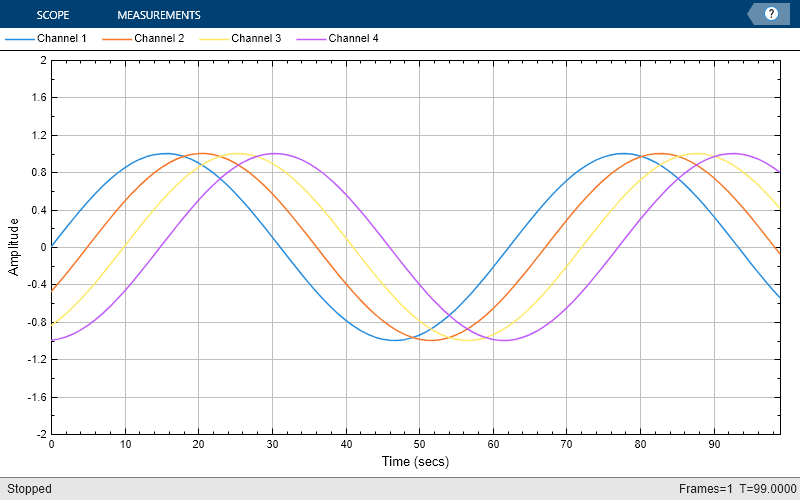 ts = timescope(YLimits=[-2 2]); x = linspace(0,10).'; y1 = sin(x); y2 = sin(x-0.5); y3 = sin(x-1); y4 = sin(x-1.5);