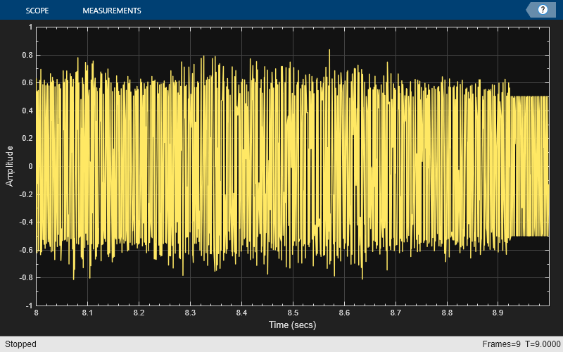 eta = 0.5 * sin(2*pi*1000/Fs*(0:396899)' + 10*sin(2*pi/Fs*(0:396899)')); signalSource = dsp.SignalSource(eta,... 'SamplesPerFrame',audioReader.SamplesPerFrame,... 'SignalEndAction','Cyclic repetition'); release(audioReader); release(timeScope); release(audioWriter); while ~isDone(audioReader) x = audioReader() / 2; s = x + signalSource(); timeScope(s); audioWriter(s); end