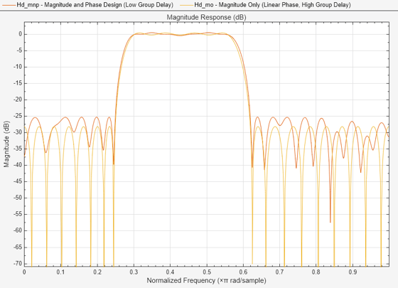 FA = filterAnalyzer(Hd_mnp, Hd_mo); setLegendStrings(FA,["Magnitude and Phase Design (Low Group Delay)", ... "Magnitude Only (Linear Phase, High Group Delay)"])
