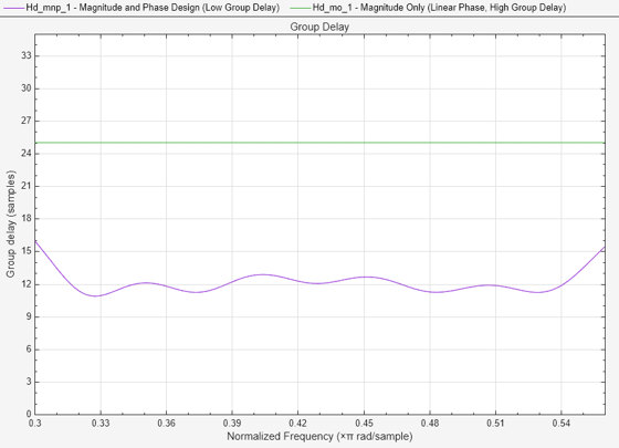 FA = filterAnalyzer(Hd_mnp, Hd_mo,Analysis='groupdelay'); setLegendStrings(FA,["Magnitude and Phase Design (Low Group Delay)", ... "Magnitude Only (Linear Phase, High Group Delay)"]) zoom(FA,"xy",[0.3 0.56 0 35]);