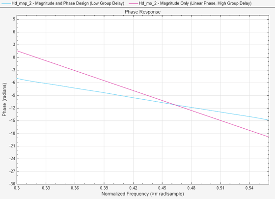 FA = filterAnalyzer(Hd_mnp, Hd_mo,Analysis='phase'); setLegendStrings(FA,["Magnitude and Phase Design (Low Group Delay)", ... "Magnitude Only (Linear Phase, High Group Delay)"]) zoom(FA,"xy",[0.3 0.56 -30 10]);