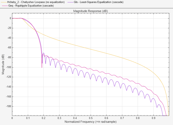 Heq_ls = designfilt('arbmagnphasefir',FilterOrder=51,NumBands=2,... BandFrequencies1=F1,BandFrequencyResponse1=D1,... BandFrequencies2=F2,BandFrequencyResponse2=D2,... DesignMethod='ls',SystemObject=true); % Least-Squares design Heq_er = designfilt('arbmagnphasefir',FilterOrder=51,NumBands=2,... BandFrequencies1=F1,BandFrequencyResponse1=D1,... BandFrequencies2=F2,BandFrequencyResponse2=D2,... DesignMethod='equiripple',SystemObject=true); % Equiripple design % Create the cascaded filters Gls = cascade(Hcheby,Heq_ls); Geq = cascade(Hcheby,Heq_er);