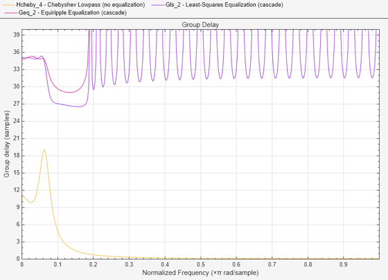FA = filterAnalyzer(Hcheby,Gls,Geq,Analysis='groupdelay'); showFilters(FA,false,FilterNames = ["Gls_2_Stage1","Gls_2_Stage2","Geq_2_Stage1","Geq_2_Stage2"]) setLegendStrings(FA,["Chebyshev Lowpass (no equalization)", ... "Least-Squares Equalization (cascade)", ... "Equiripple Equalization (cascade)"]) zoom(FA,"xy",[0 1 0 40]);