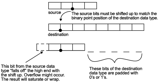 As the diagram shows, the source bits are shifted up so that the binary point matches the destination binary point position. The highest source bit does not fit, so overflow might occur and the result can saturate or wrap. The empty bits at the low end of the destination data type are padded with either 0's or 1's: