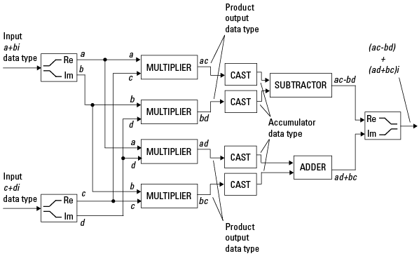 Complex-Complex Multiplication. The following diagram shows the multiplication of two complex fixed-point numbers in System Toolbox software. Note that the software returns the output of this operation in the accumulator output data type, as the next figure shows.