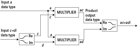 Real-Complex Multiplication. The following diagram shows the data types used in the multiplication of a real and a complex fixed-point number in System Toolbox software. Real-complex and complex-real multiplication are equivalent. The software returns the output of this operation in the product output data type, as the next figure shows.