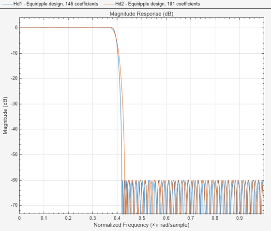 hfvt = filterAnalyzer(Hd1,Hd2); setLegendStrings(hfvt,["Equiripple design, 146 coefficients", ... "Equiripple design, 101 coefficients"])