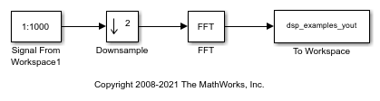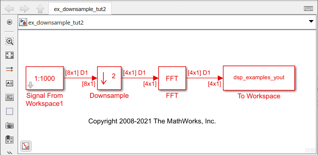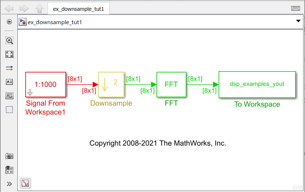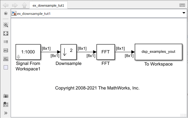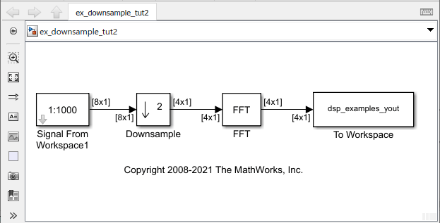 Open the model. In this model, the input signal is downsampled by a factor of 2 using the Downsample block. The Signal From Workspace block that generates the input signal has the Sample time parameter set to 0.125 seconds and the Samples per frame parameter set to 8. Therefore, the data generated by the block has a sample time of 0.125 seconds and a frame size of 8. The Input processing parameter in the Downsample block is set to Columns as channels (frame based), and the Rate options parameter is set to Allow multirate processing. This setting enables the Downsample block to operate in the multirate mode and treat data as frames of size 8.
