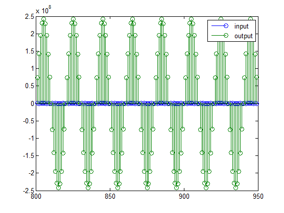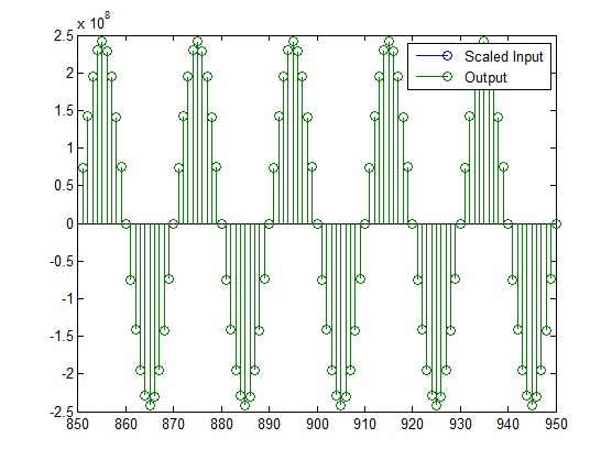 Once again, the plot shows that the input and output are at different scales. In order to scale the output so that the signals can be compared more easily in a plot, you will need to weigh the MSBs appropriately. You can compute the new fraction length using the gain of the filter when the coefficients were integer numbers: