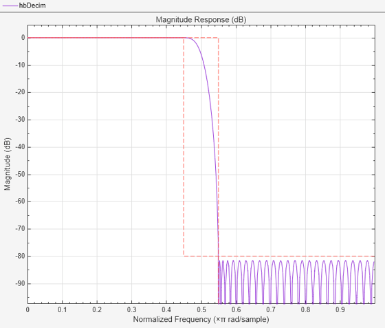 eqrDecim = designMultirateFIR(DecimationFactor=4,... OverlapTransition=false,... DesignMethod='equiripple', ... StopbandAttenuation=80,... PassbandRipple=0.1,... TransitionWidth=0.05,... SystemObject=true);