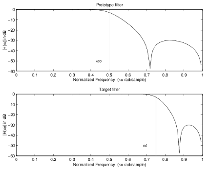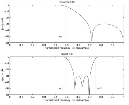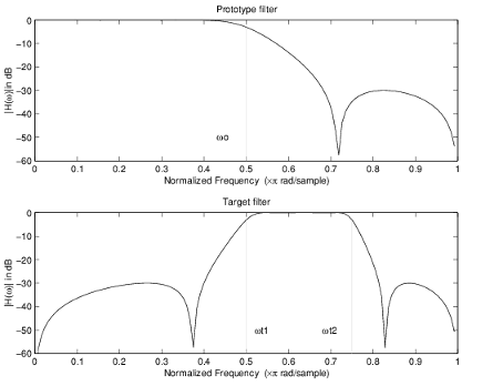 The example below shows how to apply this transformation to rotate the response of the prototype lowpass filter in either direction. Please note that because the transformation can be achieved by a simple phase shift operator, all features of the prototype filter will be moved by the same amount. Here is the MATLAB code for generating the example in the figure.