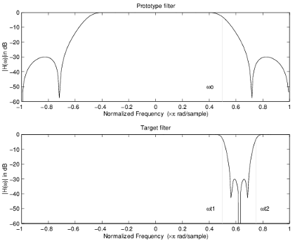 The following example shows how this transformation can be used to move the response of the prototype lowpass filter in either direction. Please note that because the target filter must also be real, the response of the target filter will inherently be disturbed at frequencies close to Nyquist and close to DC. Here is the MATLAB code for generating the example in the figure.