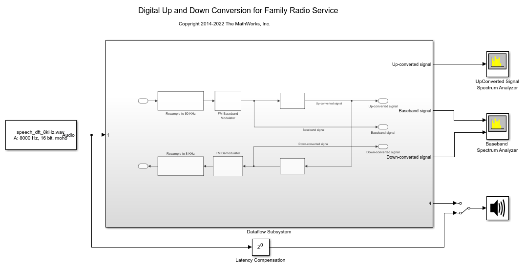 The system implemented in the model familyRadioServiceExample.slx uses speech signal as an input, and an audio playback as an output for the received signal. The 8 KHz speech is first resampled to 50KHz. The DUC at the transmitter up converts the signal from 50 KHz to 2 MHz and shifts the signal to an IF frequency of 455 KHz. The receiver has an analog front end that brings the received signal to an IF frequency of 455 KHz. The signal is then sampled at a rate of 2 MHz. The DDC at the receiver brings the signal back to the baseband with a sample rate of 50 KHz, which covers the speech frequency range of 8 KHz.