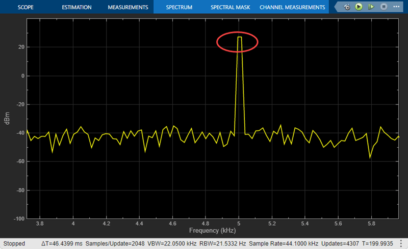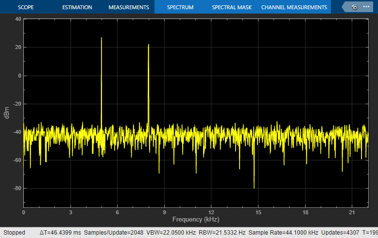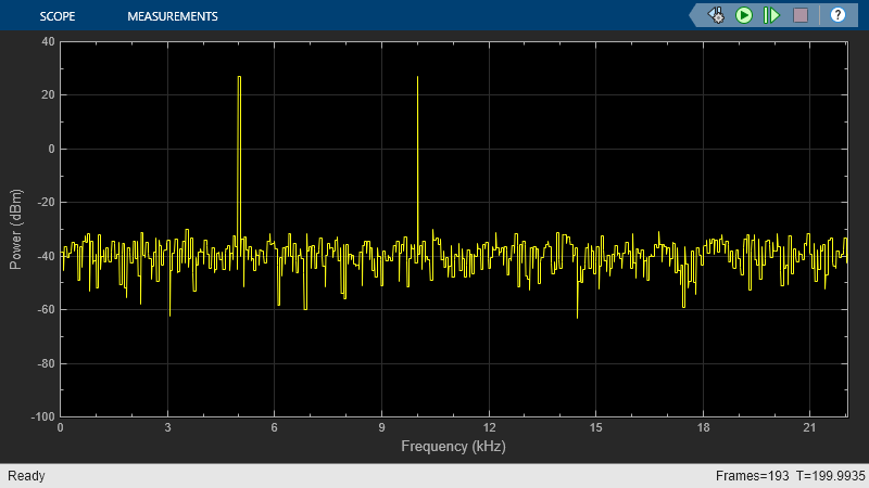 Run the model. The Spectrum Analyzer shows two tones at frequencies 5000 Hz and 10000 Hz, which correspond to the two frequencies at the input.