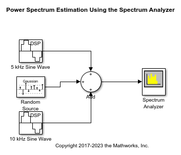 You can view the power spectrum of a signal using the Spectrum Analyzer block. The power spectrum is computed in real time and varies with the input signal, and with changes in the properties of the Spectrum Analyzer block. You can change the dynamics of the input signal and see what effect those changes have on the spectrum of the signal in real time.