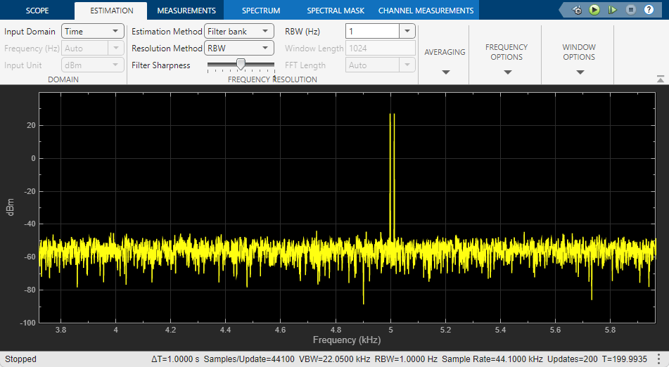 The output of the Spectrum Estimator block contains the spectral data and is available for further processing. The data can be processed in real-time or it can be stored in the workspace using the To Workspace block. This example writes the spectral data to the workspace variable Estimate.