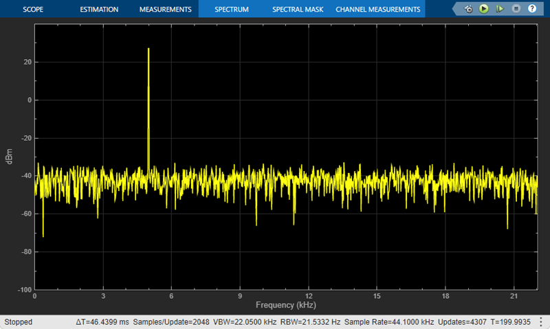 Using this value of RBW, the number of input samples used to compute one spectral update is given by Nsamples = Fs/RBW, which is 44100/21.53 or 2048.