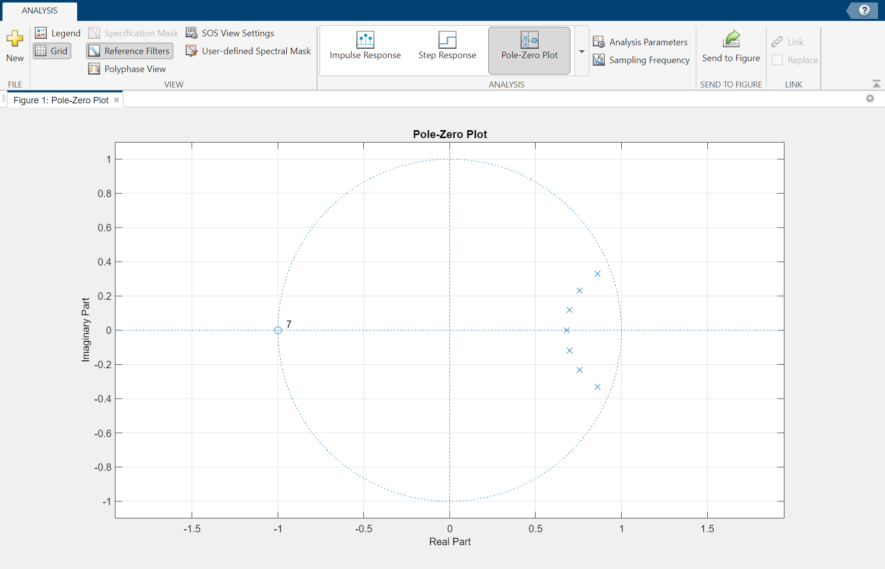 The pole-zero plot for the seventh-order Butterworth design shows the expected clustering of 7 poles around an angle of zero radians on the unit circle and the corresponding 7 zeros at an angle of π radians.