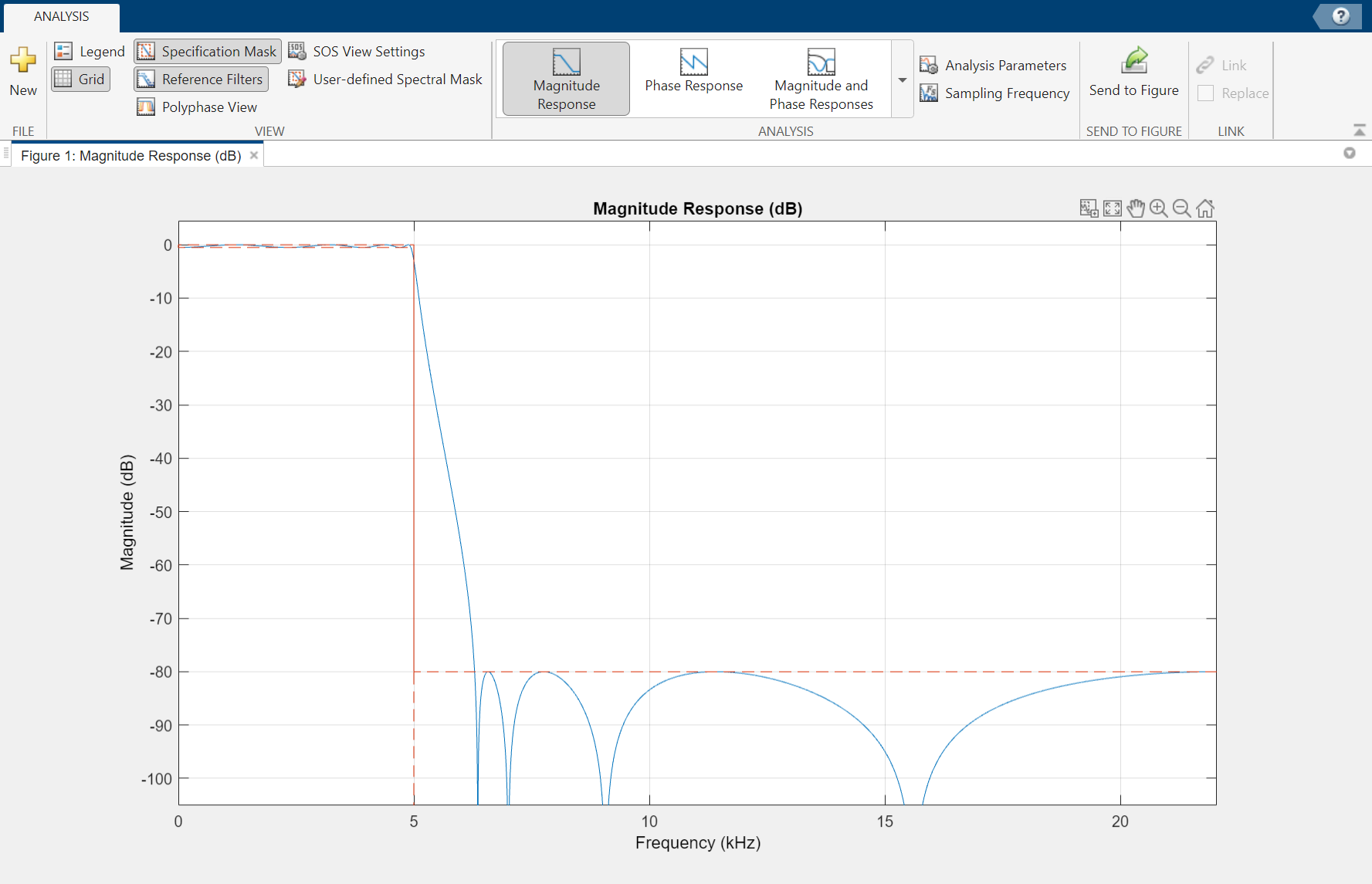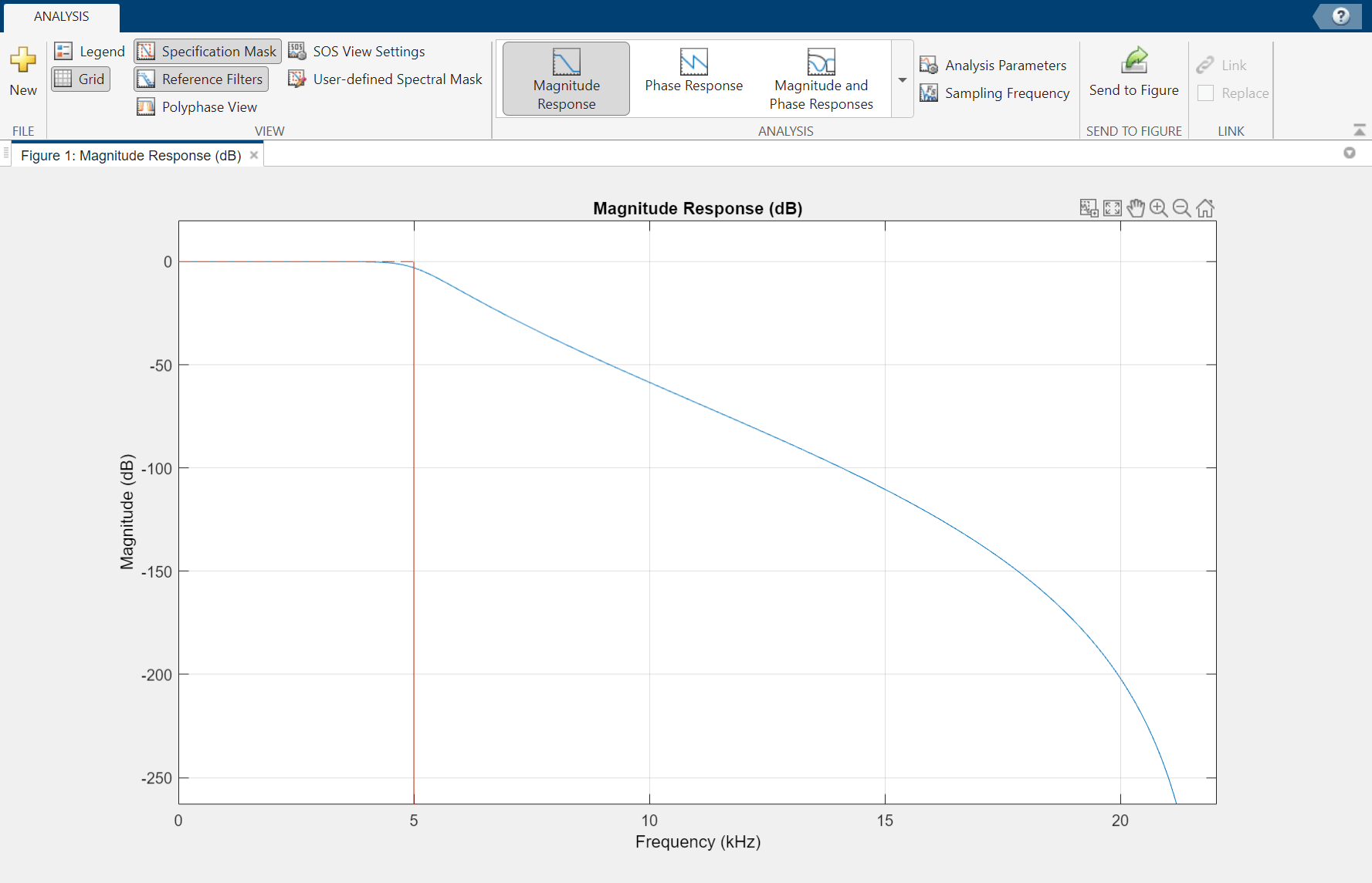 Click Apply. To visualize the filter's frequency response, click View Filter Response. The filter is maximally flat. There is no ripple in the passband or in the stopband. The filter response is within the specification mask (the red dotted line).