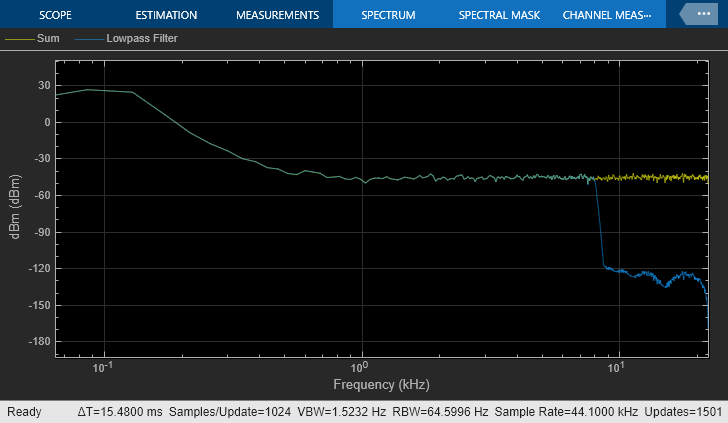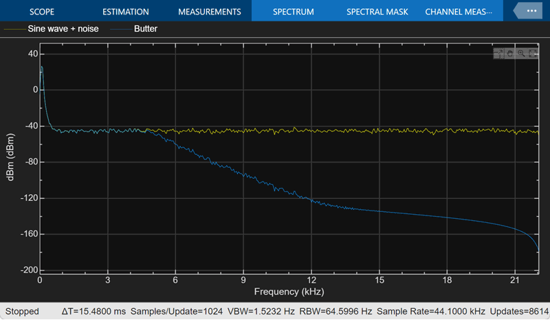 In the model, a noisy sine wave sampled at 44.1 kHz passes through the filter. The sine wave is corrupted by Gaussian noise with zero mean and a variance of 10e-5. Run the model. The view in the Spectrum Analyzer shows the original and filtered signals.
