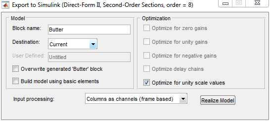 Similar to the Butterworth filter, you can generate a block from this design by clicking Generate Model on the Code Generation tab, and then clicking Realize model.