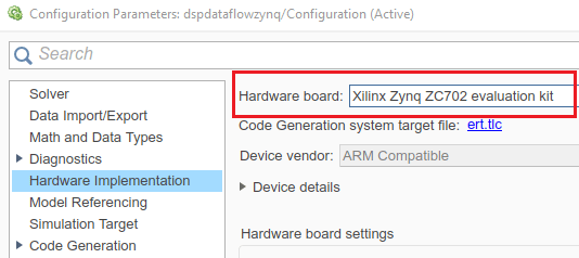 Configure the model to generate code for the Zynq-based hardware. This example uses a Zynq-7000 SoC ZC702 Evaluation Kit and performs processor-in-the-loop (PIL) simulation on the target hardware.