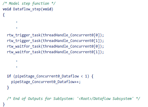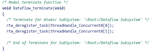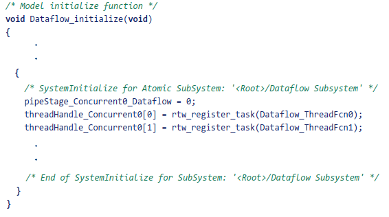 The Dataflow Subsystem block generates two thread functions, Dataflow_ThreadFcn0 and Dataflow_ThreadFcn1.