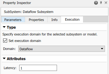 Dataflow domains automatically partition your model and generates code with multiple threads for multicore targets. In Simulink, you specify dataflow as the execution domain for a subsystem by setting the Domain parameter to Dataflow using Property Inspector. You can view the Property Inspector for a subsystem, first by selecting the subsystem and then selecting View>Property Inspector. In the Property Inspector, you can set the domain to dataflow by selecting Set domain specification and then selecting "Dataflow" for Domain setting. You can also use the Dataflow Subsystem block from the Dataflow library of DSP System toolbox to get a subsystem that is preconfigured with the dataflow execution domain.