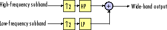 The unit takes in adjacent high-frequency and low-frequency subbands, and reconstructs them into a wide-band signal. Compared to each subband input, the output has twice the bandwidth and twice the sample rate.