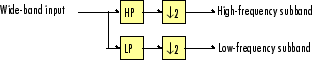 The Dyadic Analysis Filter Bank block decomposes a broadband signal into a collection of subbands with smaller bandwidths and slower sample rates. The Dyadic Synthesis Filter Bank block reconstructs a signal decomposed by the Dyadic Analysis Filter Bank block.