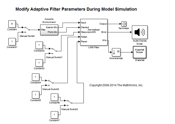 In the previous topic, LMS Filter Configuration for Adaptive Noise Cancellation, you created an adaptive filter and used it to remove the noise generated by the Acoustic Environment subsystem. In this topic, you modify the adaptive filter and adjust its parameters during simulation. This topic assumes that you are working on a Windows operating system.