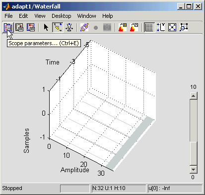 Double-click the Waterfall Scope block. The Waterfall scope window opens. Click the Scope parameters button.