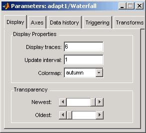 Close the Parameters window leaving all other parameters at their default values. You might need to adjust the axes in the Waterfall scope window in order to view the plots.