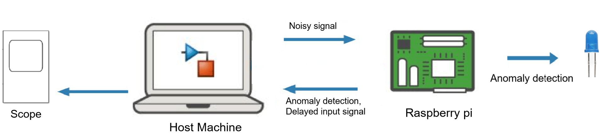 The Deep Signal Anomaly Detector block detects anomalies in input data by reconstructing the input signal using a trained deep learning network and thresholding the loss of reconstruction. This example uses a long short-term memory (LSTM) forecaster model trained on normal sinusoid data and uses the trained model to detect the presence of anomalies in sinusoid data containing anomalies. The anomaly detection model is deployed on Raspberry Pi hardware. The host computer sends anomalous data to the Raspberry Pi via UDP, which performs anomaly detection and illuminates the in-built LED when the presence of an anomaly is detected.