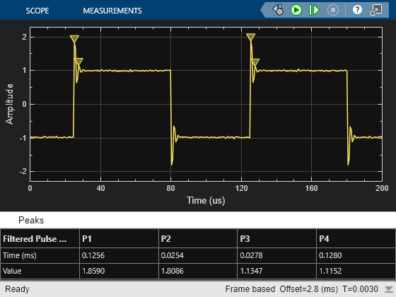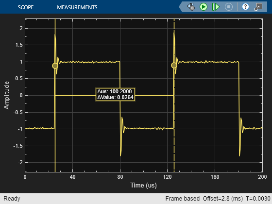 The edges of the pulses are fairly steep, with a slew rate of about 4 V/us. The example uses an underdampened filter to achieve this rate. Changing to an overdamped filter will decrease the rate at which the edge of each pulse can transition between pulse levels. The output of an underdampened filter exhibits significant ringing immediately after changing between low and high states. To quantify this ringing behavior, you can use the measurements in the Overshoots / Undershoots list.