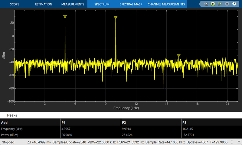 Open and run the model. You can see the spectrogram output showing the two sinusoidal tones in the spectrum analyzer window. To acquire and store the data for further processing, create a SpectrumAnalyzerBlockConfiguration object and run the getSpectrumData function on this object.