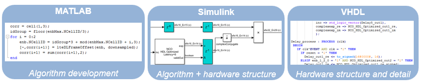 This diagram shows the design progression from mathematical algorithm in MATLAB, to hardware-compatible implementation in Simulink, and then the generated VHDL code.