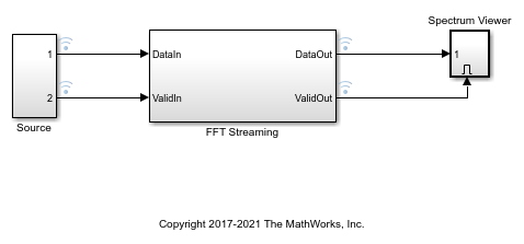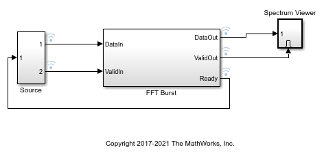 This example includes two models, which show how to use the streaming and burst architectures of the FFT block. The streaming model shows how to use the input and output valid control signals to model data rate independently from the clock rate. The burst model shows how to use the valid control signal to model bursty data streams and how to use a ready signal that indicates when the algorithm can and cannot accept new data samples.