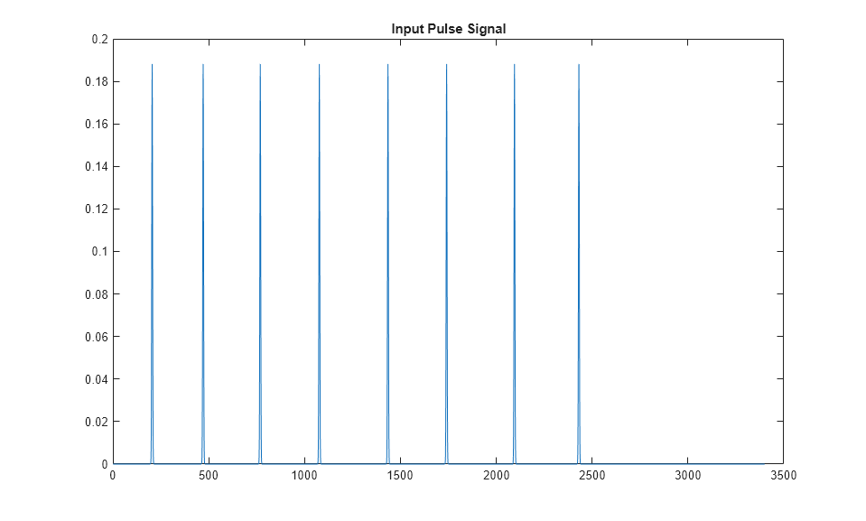 pulseLength = 17; % Number of samples per symbol N = pulseLength * 200; % 200 symbols tx = zeros(N,1); temp = primes(round(.80*N)); % Place pulses at a few scattered locations. Offset is a prime number. locations = temp(45:45:end); for index = 1:length(locations) tx(locations(index):locations(index) + pulseLength - 1) = pulse; end figure plot(tx); title('Input Pulse Signal')