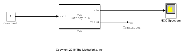 Open and simulate the model. The NCO block in the model is configured with the variables calculated in this script. The output word length and fraction length depend on the constraints of your hardware; this example uses a word length of 16 and a fraction length of 14.