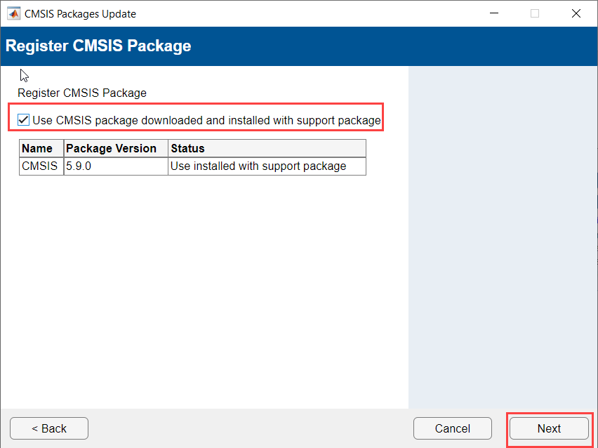 Unselect the Use CMSIS package downloaded and installed with support package to use a different version of CMSIS other than the current version provided with the installed support package.