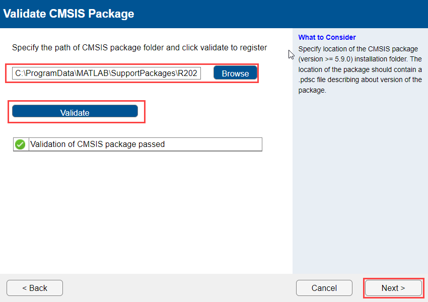 Click Browse and locate the CMSIS package folder. Validate the CMSIS package.