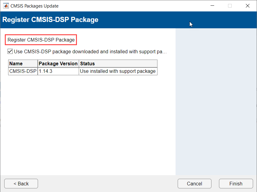Register and Validate the CMSIS-DSP package. Click Finish.
