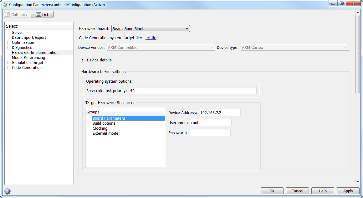 Board Parameterspane.The Device Address parameter displays the IP address of the most recent connection to a BeagleBone Black board.