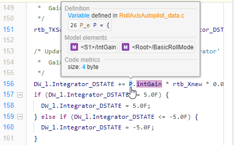intGaininRollAxisAutopilot_data.c, click the definition code in the dialog box.