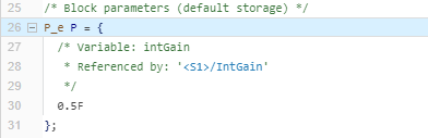 intGaintoModel default, which indicates that the parameter object prevents code generation optimizations from eliminating storage for the variable. With this setting, the object uses the storage class specified in the Code Mappings editor as the data default for category Model parameters.Save the model and regenerate the code.
