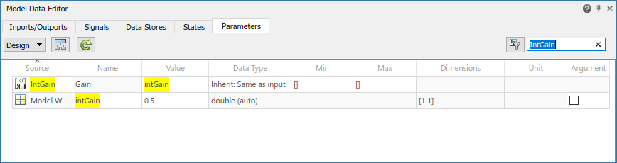IntGain. The Model Data Editor shows a row that corresponds to the Gain parameter and a row that corresponds to a workspace variable.