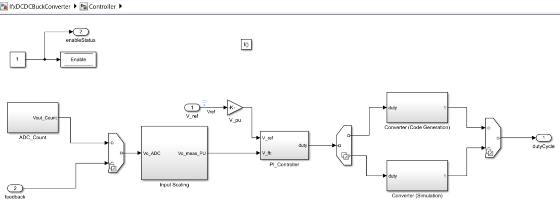 The ADC Interrupt task contains the feedback control algorithm that executes in response to each ADC conversion event and generates duty cycle values for the PWM block. In simulation mode, this behavior is emulated by function call generator subsystem.