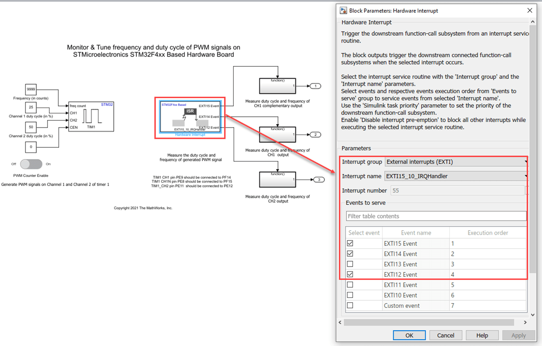 DownandCenteraligned modes by configuring in STM32CubeMX project.Configure Hardware Interrupt block to trigger function call subsystems for Timer events like update event, capture compare events etc. You can also generate these events using input ports by enabling the inputs for corresponding events under Events section in the block.