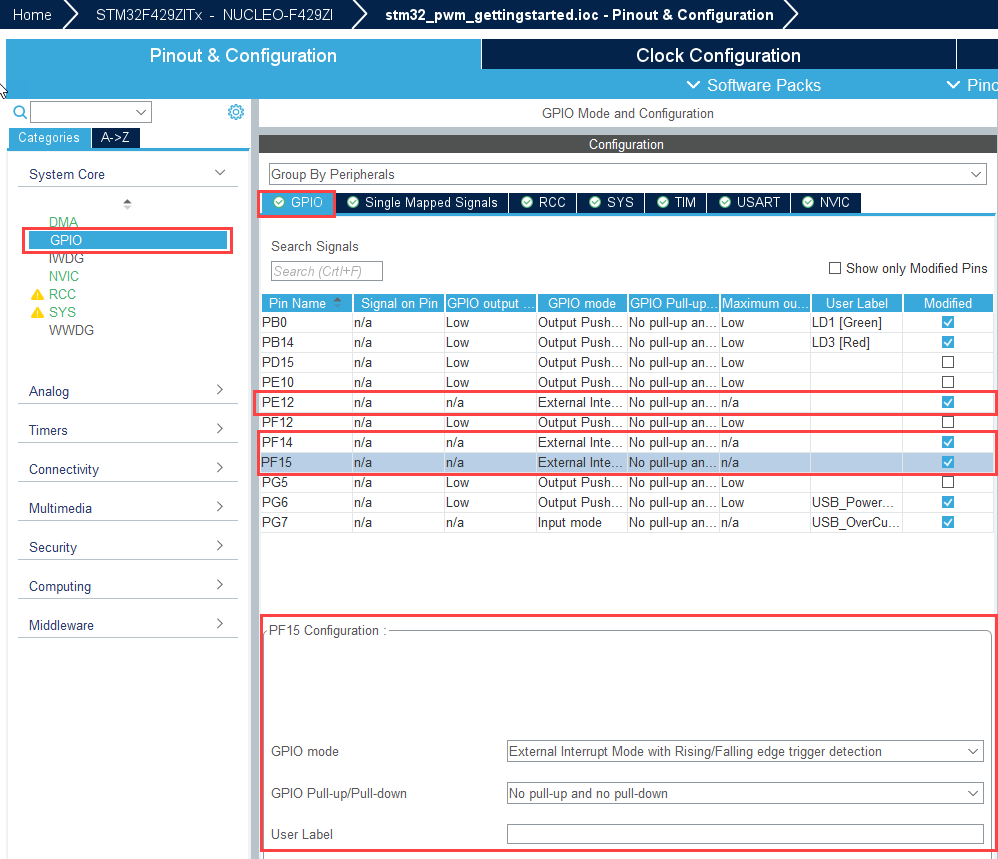 PF14,PF15,PE12and right click on pins and configure them asGPIO_EXT14,GPIO_EXT115, andGPIO_EXTI12respectively.In System core > GPIO, ensure these pins are configured for GPIO mode as